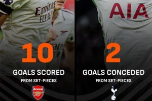 矛与盾!阿森纳定位球进10球英超第一,热刺定位球丢2球英超最少
