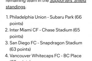 根据常规赛积分情况,积分最高的费城联(66分)今天被淘汰,迈阿密(65分)成为目前积分最高球队,将占据主场优势。